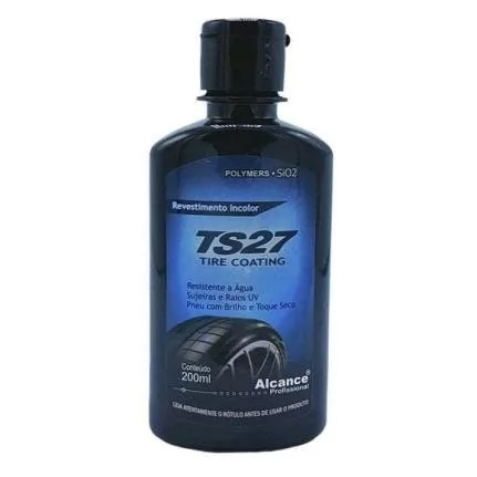 Alcance TS27 200ML - Revestimento Incolor P/ Pneus Com Sio2 é um Produto transparente desenvolvido com Polímero Sintético e SiO2, resistente a água, sujeiras e raios UV, deixando o pneu com brilho e toque seco.