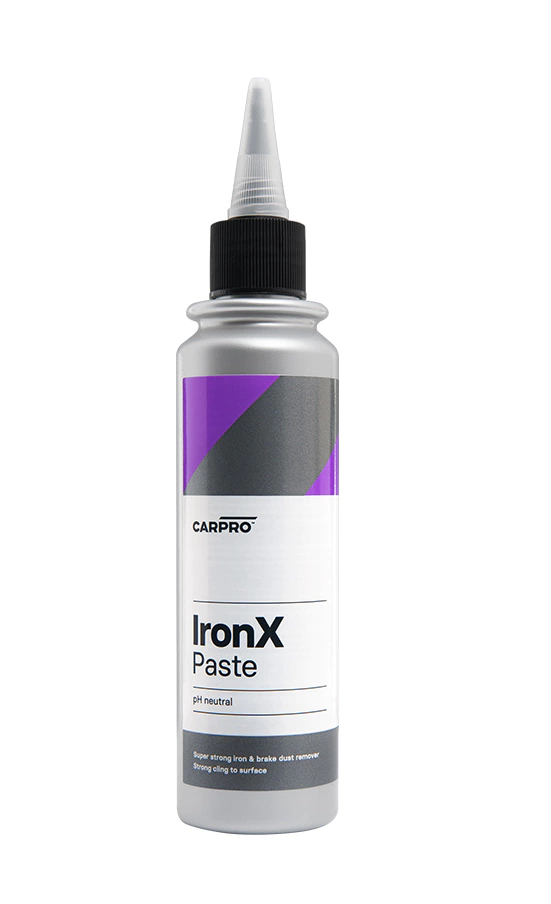 CarPro IronX Paste possue uma fórmula avançada de pH balanceado (pH-7) da IronX decompõe com segurança a contaminação metálica ferrosa causada por freios automotivos, viagens ferroviárias e construção em superfícies delicadas de veículos. Pode ser usado em jantes de tinta, plástico, cromo, vidro e liga leve. IronX funciona formando um complexo solúvel em água com partículas de ferro alojadas na superfície, permitindo que sejam enxaguadas livremente, enquanto limpa mais profundamente do que a lavagem ou argila sozinho.