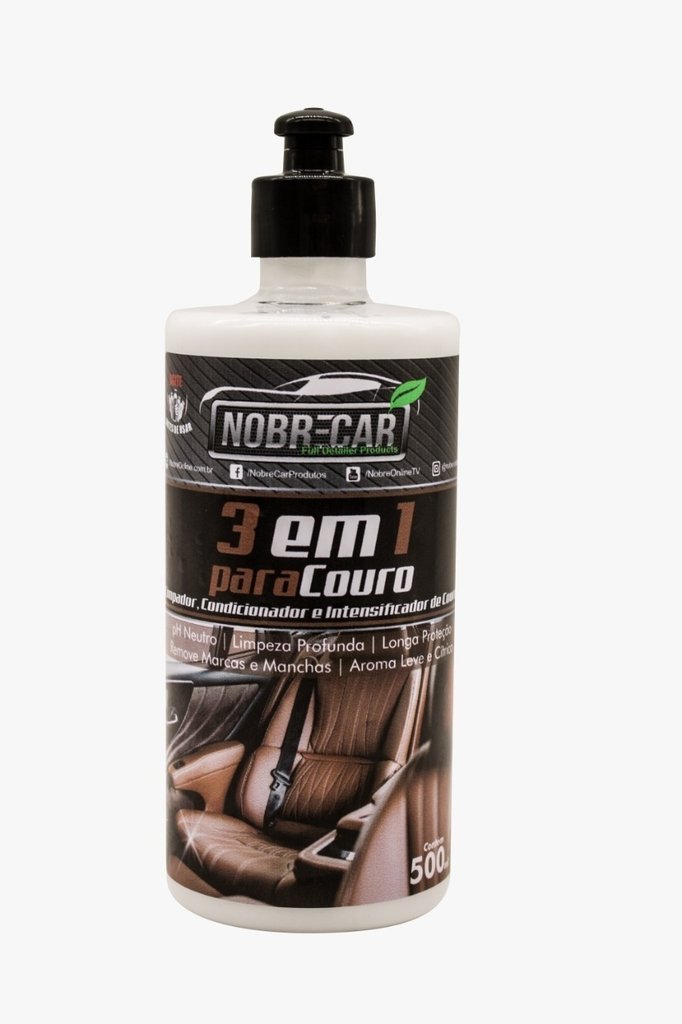 Nobre Car 3 em 1 para Couro - Limpa, Condiciona e Realça a Cor 500ml possui uma tecnologia avançada de pH neutro que limpa o couro sem danificar. Produto não abrasivo de rápido e fácil utilização que promove também o Condicionamento e intensidade no couro fazendo com que o mesmo tenha uma ótima maciez e aroma leve e cítrico.