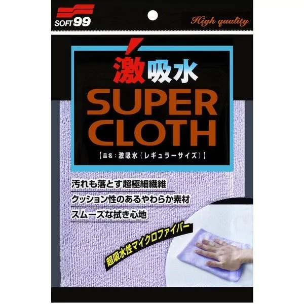 Soft99 SUPER CLOTH - MICRO FIBRA DE ALTA ABSORCAO é uma toalha de trama macia com fibras 100 vezes mais finos que um fio de cabelo, absorvendo liquido e sujeira rapidamente. Absorve 16 vezes mais rápido que toalhas comuns de algodão. Produto desenvolvido para evitar desfiamento durante o uso, evitando assim a soltura de fiapos.