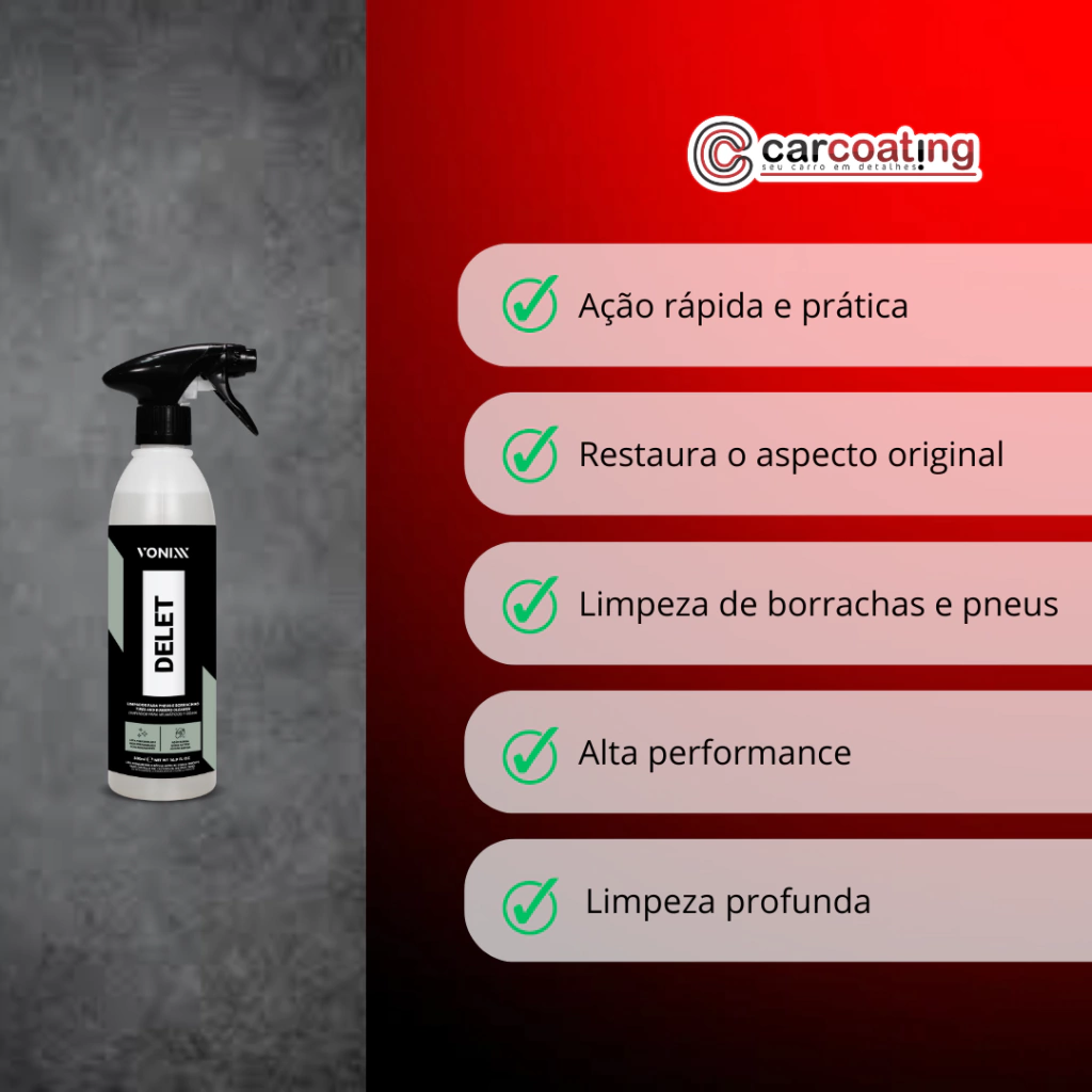 O Delet da Vonixx limpa e restaura o acabamento original das borrachas e pneus, deixando-os prontos para receber a proteção.