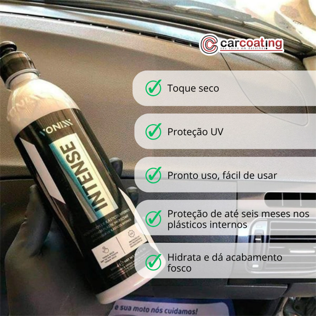 O Intense da Vonixx deve ser utilizado especialmente na parte interna do automóvel, em superfícies como vinil e plásticos em geral, também pode ser utilizados em painéis soft touch.