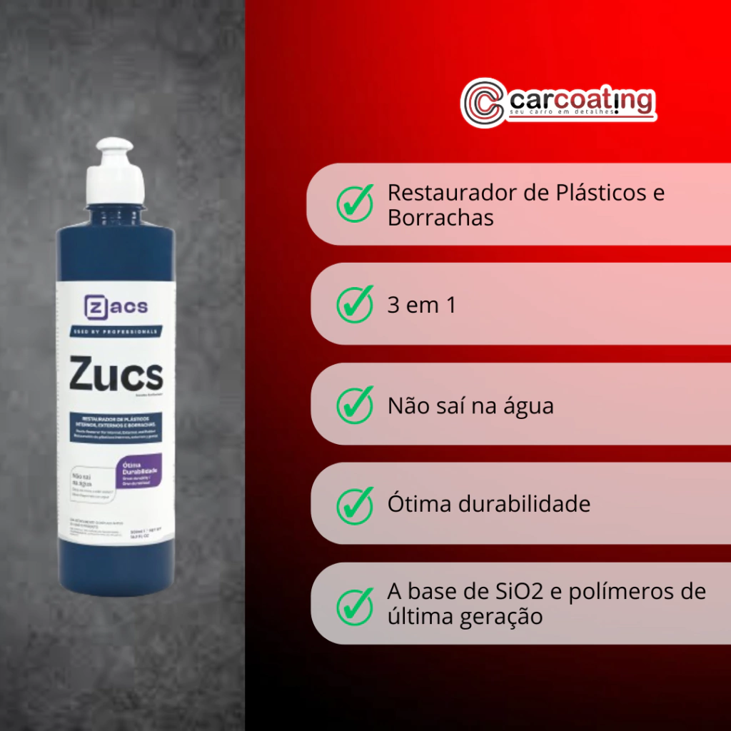 Zacs Zucs Restaurador de Plásticos 3 em 1 500ml é um restaurador de plásticos 3 em 1, desenvolvido para restaurar plásticos internos, plásticos externos e borrachas em geral.